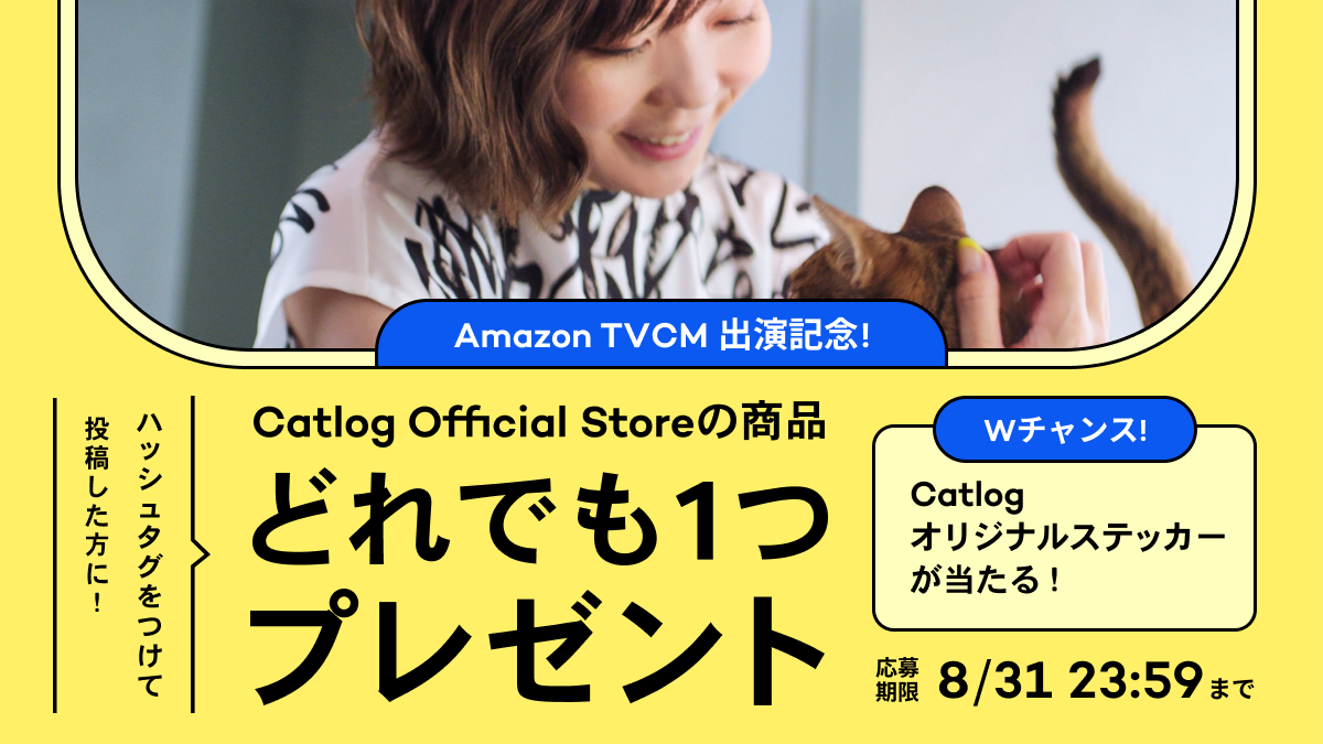 今回のAmazonのテレビCM出演を記念して、弊社ではSNSのキャンペーンを開催!#Catlog見たよ報告会 のハッシュタグをつけてコメントや写真と共にTwitter、もしくはInstagramにて投稿をしていただくと、投稿いただいたみにゃさまの中から抽選で合計5名様にCatlog Official Storeで販売中の商品をどれでも1つプレゼント!また、さらに合計100名様にオリジナルステッカーをプレゼントいたします。
