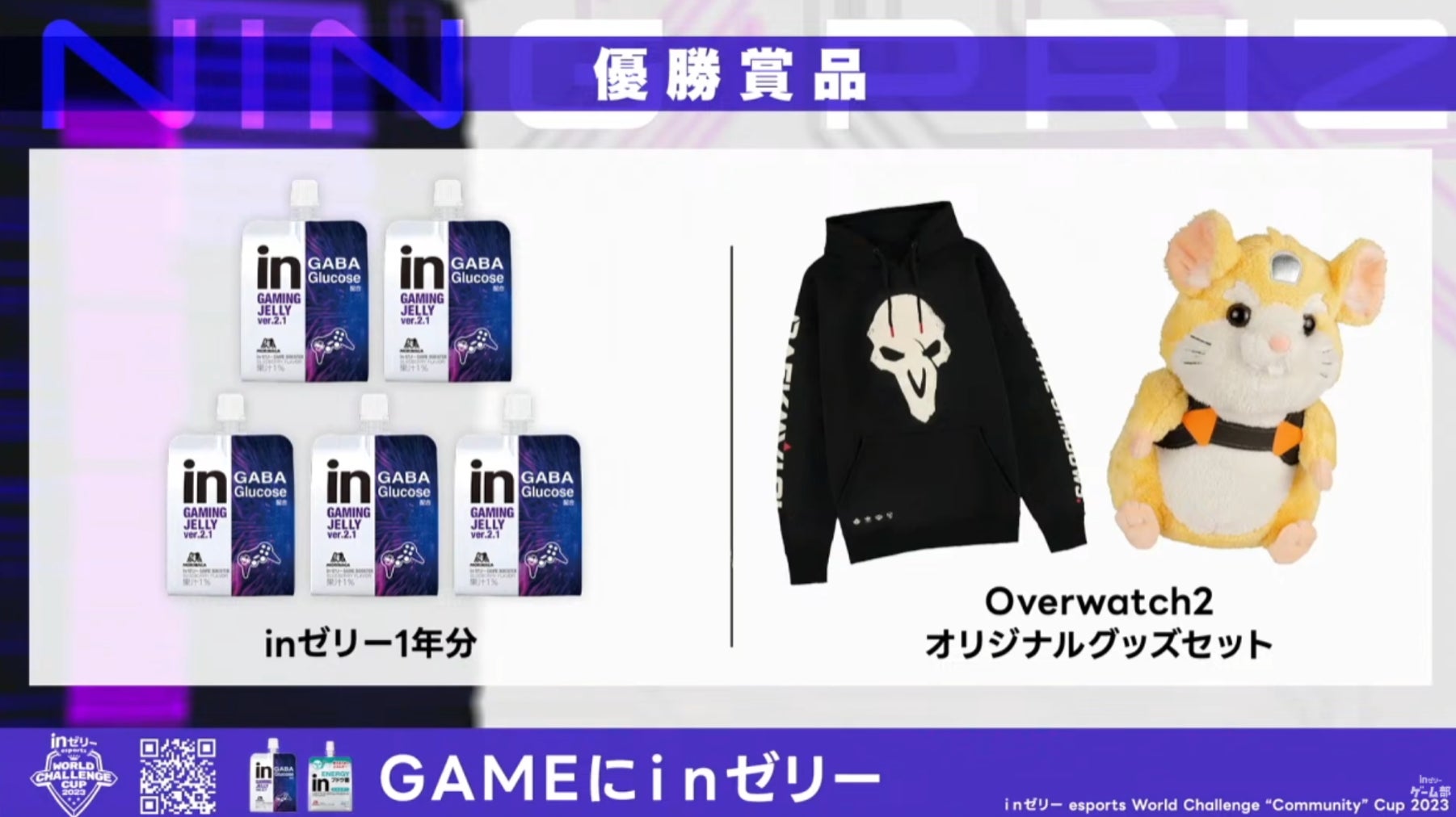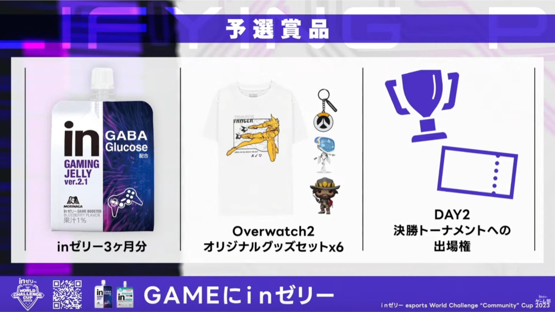 予選トーナメントを勝ち抜いた上位3チームには、inゼリー3ヶ月分、Overwatch2オリジナルグッズセット×6、DAY2決勝トーナメントへの出場権がプレゼントされ、今大会優勝チームにはinゼリー1年分とOverwatch2オリジナルセットがプレゼントされます。