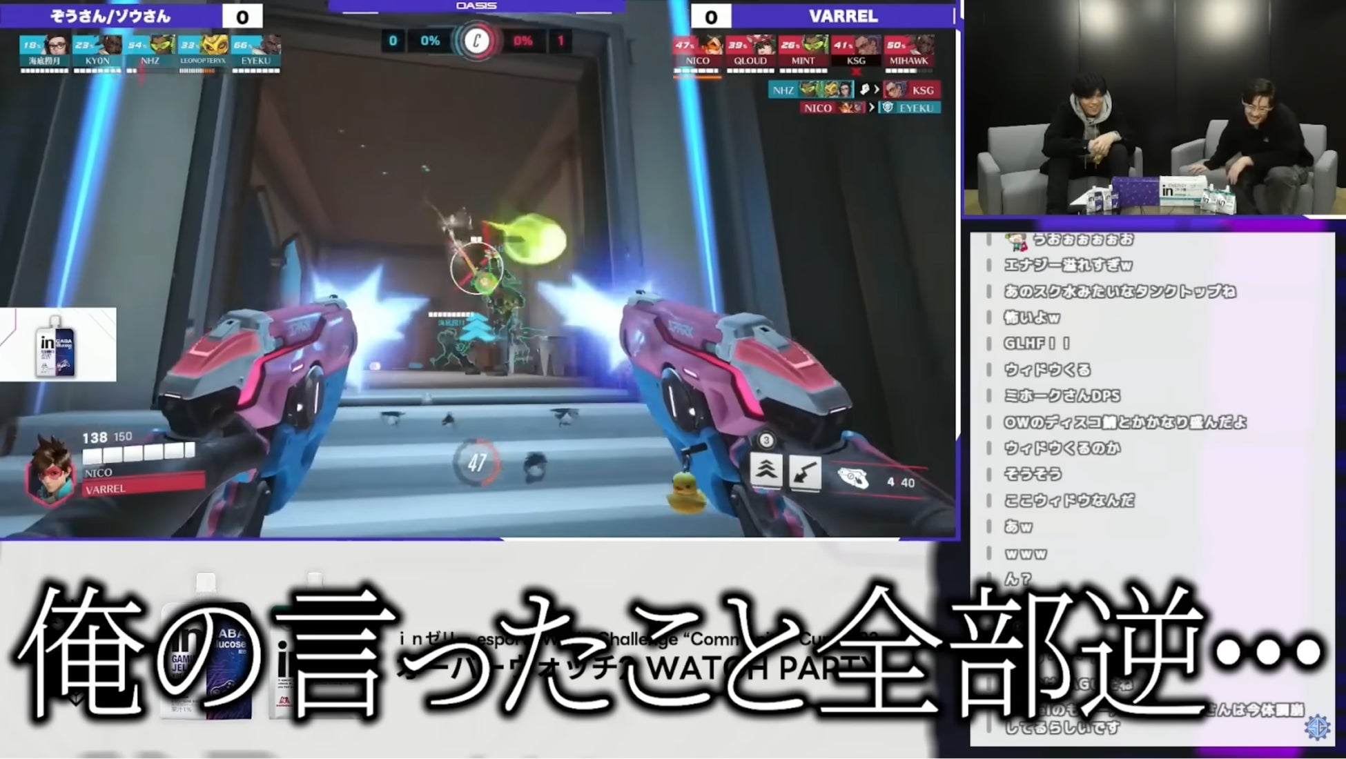 待ちに待ったVARREL開幕の構成はRush構成。対するぞうさん/ゾウさんはDive構成からのスタートとなりましたが、序盤ぞうさん/ゾウさんのKYON選手が国内最強の「トレーサー」使いであるNico選手を”トレーサー”でキルするという波乱の幕開けとなりましたが、そんなチャンスも束の間、Nico選手に火が付き、圧倒的な連携力を見せつけ初戦をあっという間に取得しました。