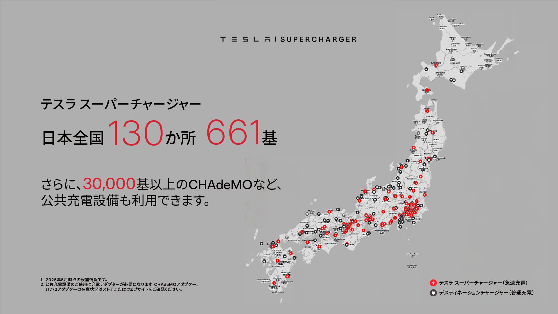 テスラがデザインしたスーパーチャージャーは、わずか数十分で充電が完了し、旅行や移動中に充電で停車する回数、時間を最小限に抑えるよう戦略的に配置されています。スーパーチャージャーは現在日本で展開されているあらゆる充電技術よりも高性能であり、最大250kWの出力で約15分で最大275km走行分を充電できます。スーパーチャージャーネットワークは、北米、ヨーロッパ、そしてアジア太平洋地域の主要ルートを繋ぎ、合計で 60,000 基以上が設置され、国内では130箇所 661基が稼働しています。