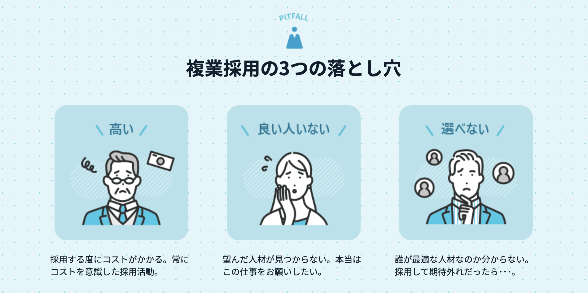 複業採用をする際によくある課題である以下の3つを解決しております。