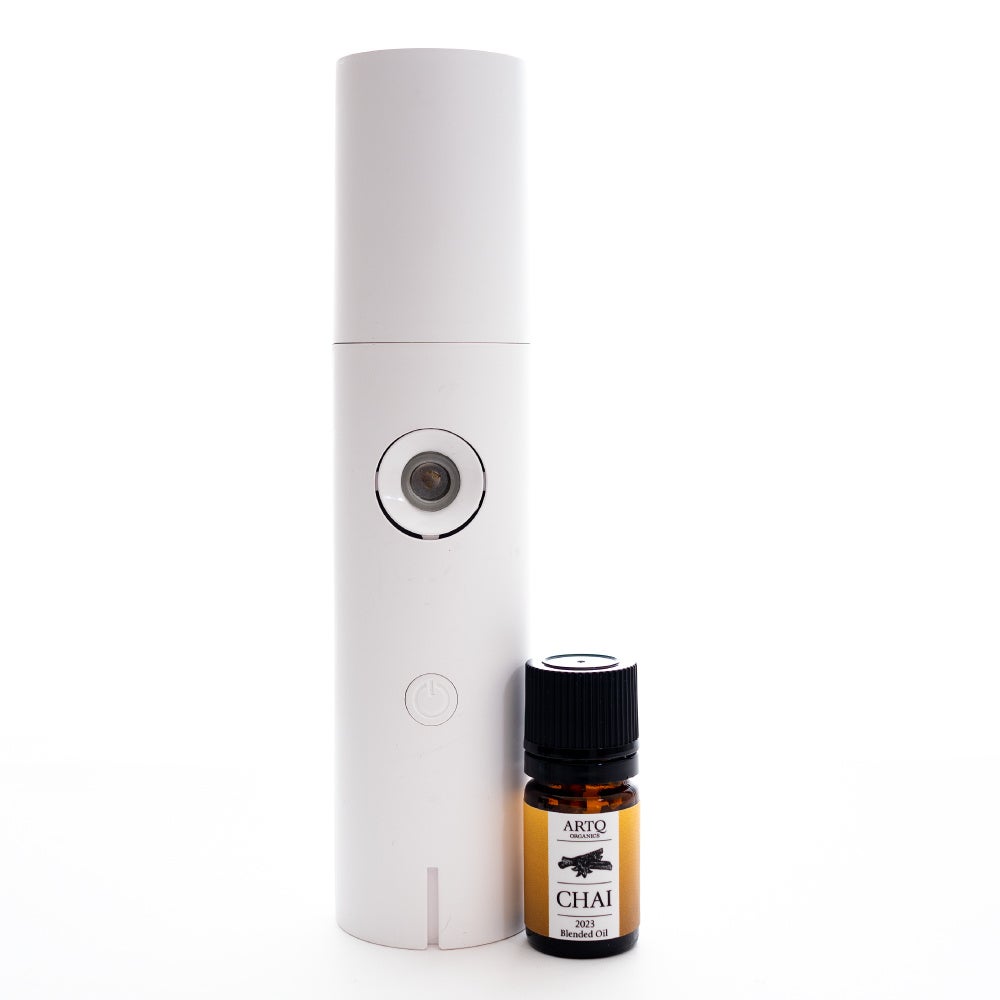 精油ボトルをそのままセットするだけ!どこへでも持ち運べる大変便利なディフューザーと「チャイブレンド」のお得なセットです。