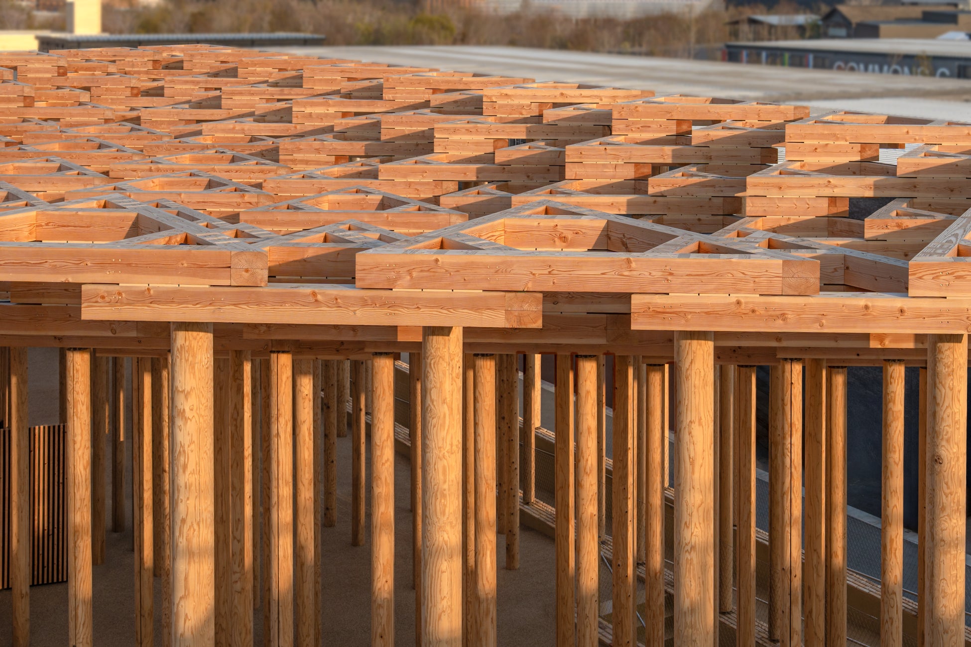 2025年大阪・関西万博におけるウズベキスタン館「Garden of Knowledge: A Laboratory for a Future Society(知の庭園:未来社会のためのラボラトリー)」は、建築、展示、そして没入型のストーリーテリングを通して同国の変革を紹介するパビリオンである。建築は歴史的なキャラヴァンサライ(隊商宿)に着想を得ており、交流と学びの場としての空間を現代的に再解釈している。屋上には、ヒヴァのジュマ・モスクの列柱ホールを想起させる彫刻的な木造構造によるルーフトップガーデンが設けられている。内部ではサステナビリティ、イノベーション、教育といったテーマを展示し、360度のマルチメディア体験を伴う上昇式プラットフォームが来場者の大きな見どころとなる。パビリオンは再利用可能な構造として計画されており、会期後にはヌクスへ移設され、子ども図書館の一部として再建される予定である。