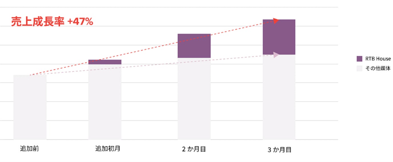 RTB Houseではリセラープログラムを、株式会社マクアケが運営するアタラシイものや体験の応援購入サービス「Makuake」において先行実施しています。Makuakeでプロジェクトを掲載する50の実行者で活用した結果、全体のROAS効率を維持したまま実行者の売上成長率が3か月間で47%向上する広告効果を得ることができました(下図)。