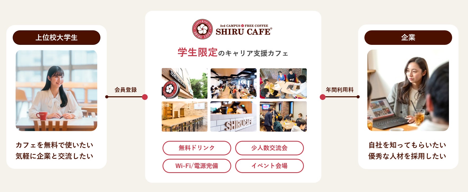 東京大学、京都大学、早稲田大学、慶應義塾大学をはじめ、全国大学内外で20店舗展開する学生限定のキャリア支援カフェです。就活生だけでなく大学1年生、2年生の若年層のキャリアも支援しています。企業と学生のオフラインの採用プラットフォームとして運営し、企業と学生との繋がりを創出しています。