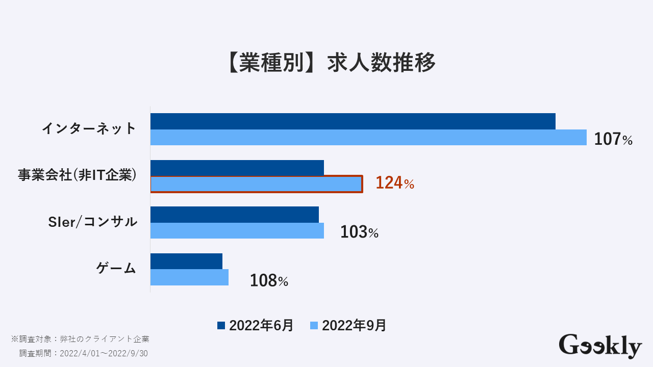 非IT系の事業会社の2022年9月の求人数は、2022年6月と比較して124%と、大きく増加しています。