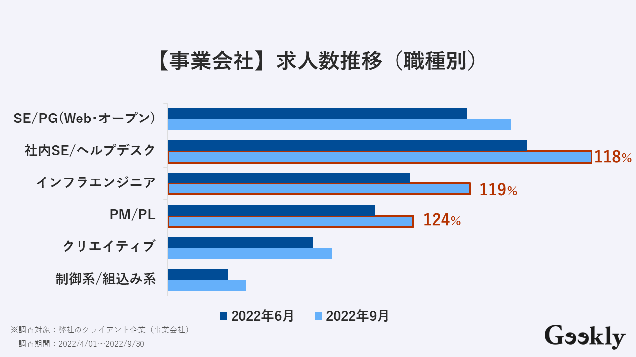 「PM」「社内SE」「インフラエンジニア」といった即戦力人材のニーズが増加