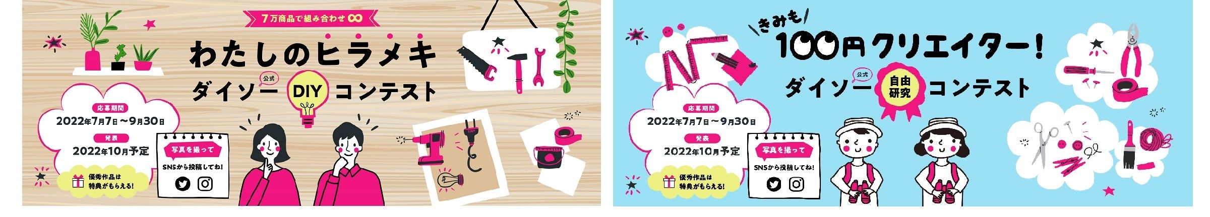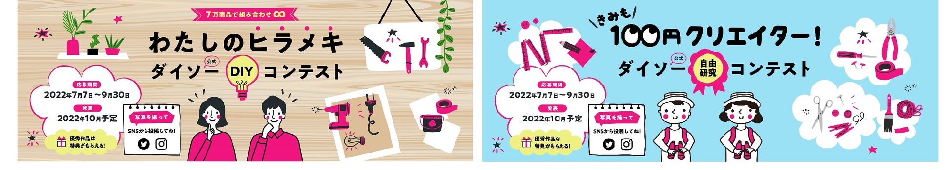 コンテストは、一般部門と、小学6年生以下を対象にしたジュニア部門の2部門で開催します。部門ごとにテーマを設定し、ダイソー商品を複数点(2点以上)使用したDIY作品の写真をSNSで応募いただきます。応募作品の中から、本年10月(予定)に入賞作品を選定、受賞者を特設サイトで発表、賞品を贈呈いたします。