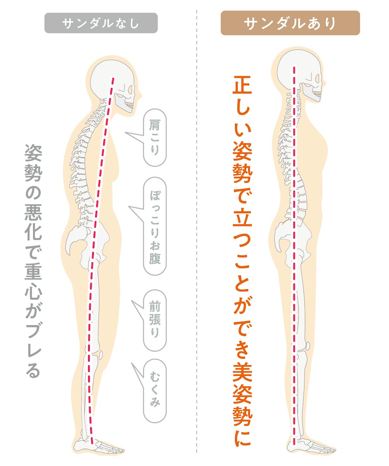 「甲痩せサンダル」では外側重心を改善し、O脚やX脚など足の形へアプローチするのはもちろん、さまざまな効果が期待できます。