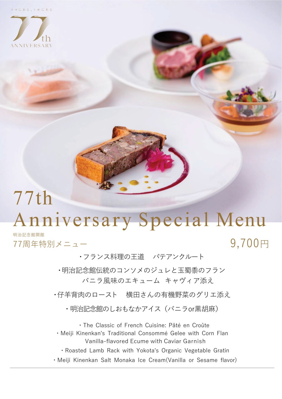 今年11月に77周年を迎える明治記念館では、日頃の感謝の気持ちを込めて、「77周年特別メニュー」をご用意いたしました。フランス料理の王道「パテアンクルート(パテのパイ包み焼き)」や「仔羊背肉のロースト」、名物「明治記念館のしおもなかアイス」など、今年しか味わえない特別なコースをご堪能ください。