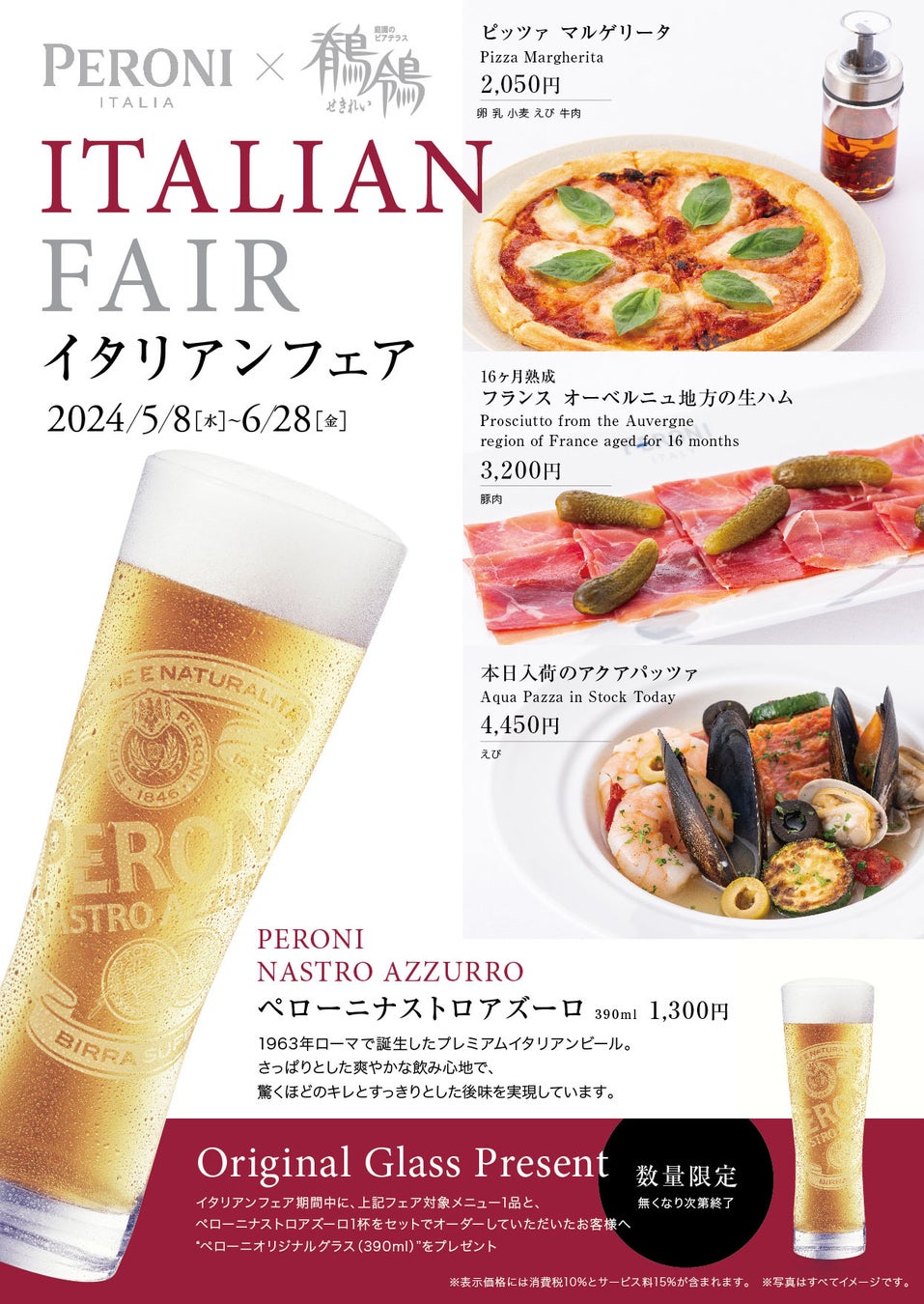 ビアテラス「鶺鴒」では、5月8日(水)から6月28日(金)まで、イタリアンビールやピッツァマルゲリータ、アクアパッツァなど、イタリア料理をお愉しみいただける「イタリアンフェア」を開催いたします。