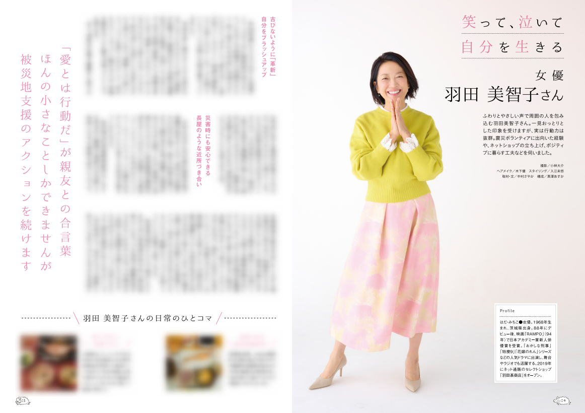 表紙と巻頭インタビューは女優・羽田美智子さんが登場。これまで行ってきた被災地への支援の取り組みやポジティブに暮らすための日々の工夫についてお話を伺いました。
