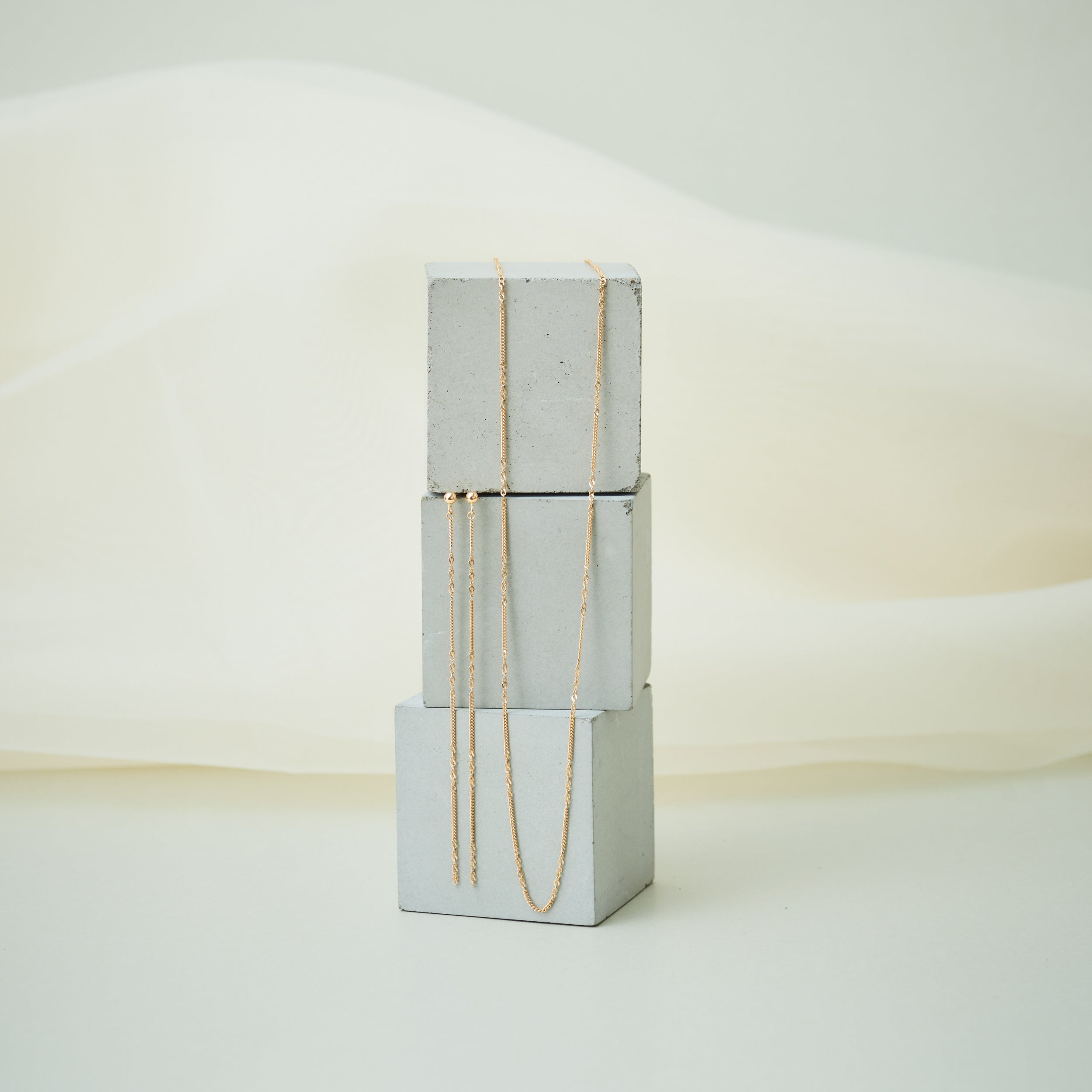 繊細なチェーンは素肌や衣類に寄り添って馴染み、フラットなチェーンは光を受けてしなやかに輝きます。