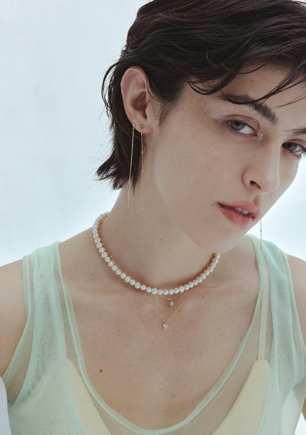 モードなボリュームのある7mmの淡水パールが、顔周りに自然な明るさとみずみずしい印象をもたらすLサイズ。遊びが効いていながら知性も漂う、二面性のあるジュエリー。