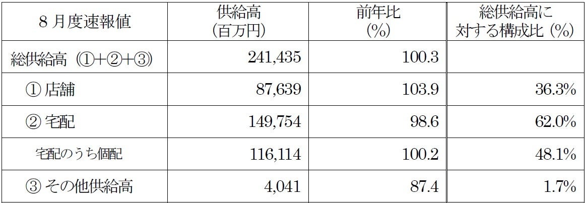 8月度の総供給高は、100.3%で前年超えでした。米の大幅伸長と地震による防災需要が全体を押し上げました。