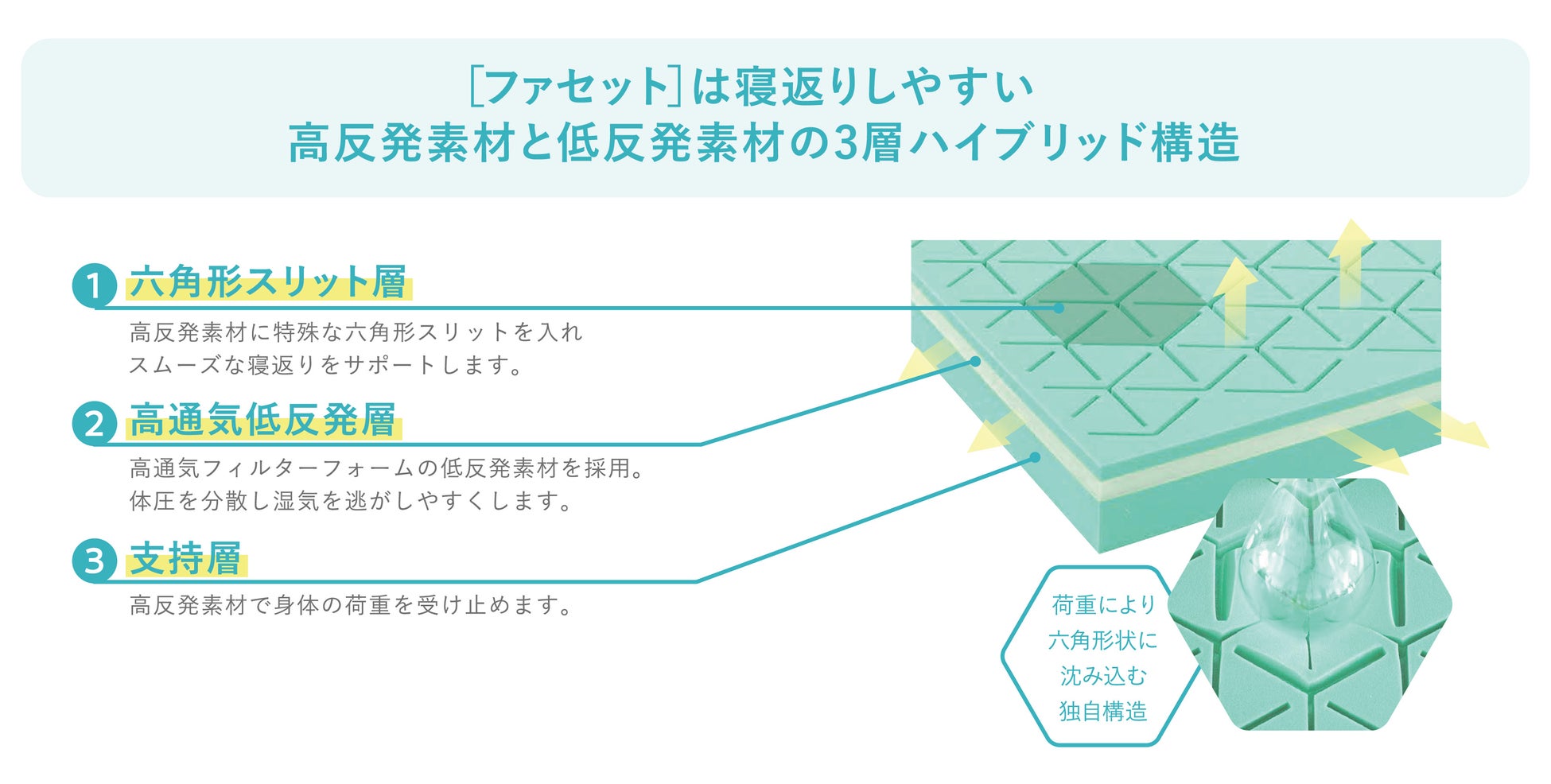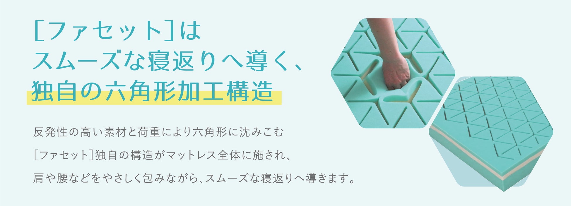 最大の特徴はスムーズな寝返りへ導く、独自の六角形構造。反発性の高い素材と荷重により六角形に沈み込む「ファセット」独自の構造がマットレス全体に施され、肩・背中・腰をやさしく包みながら、スムーズな寝返りへ導きます。