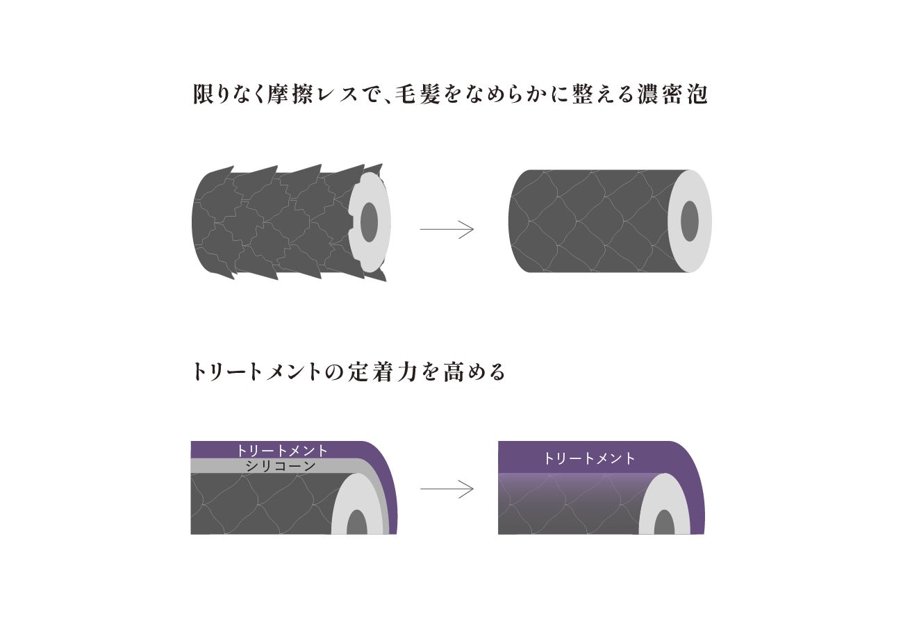 実は、毛髪をしっかりと洗髪した際は最も髪に摩擦が加わった状態であることに着目。キューティクルを整えながら摩擦レスの濃密泡で洗い上げることでなめらかな質感をつくりだします。