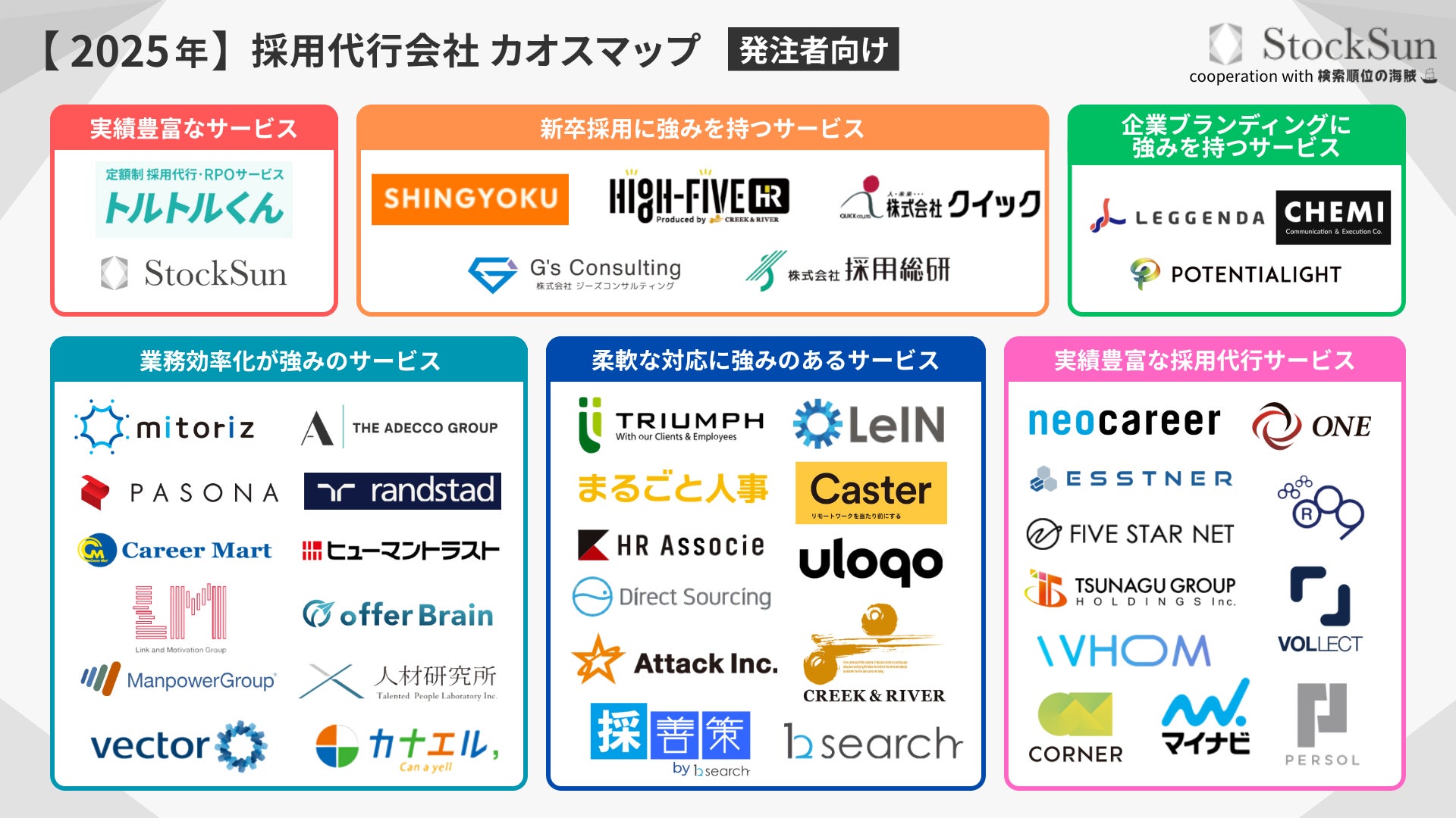 そこでStockSunは、採用支援企業の全体像を可視化し、目的に応じたパートナー選定をスムーズにするための包括的なカオスマップを作成しました。