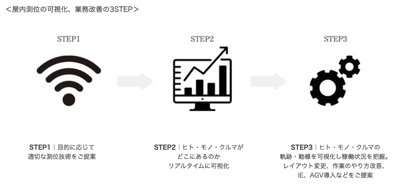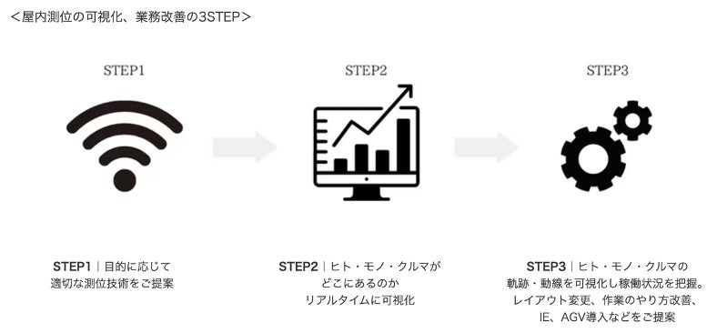 高精度に測位した位置情報や、現場から得られるデジタルデータを用いながら様々な生産工程において、これまで把握できなかった視点で生産性のボトルネックを可視化し、改善活動を継続的に支援します。