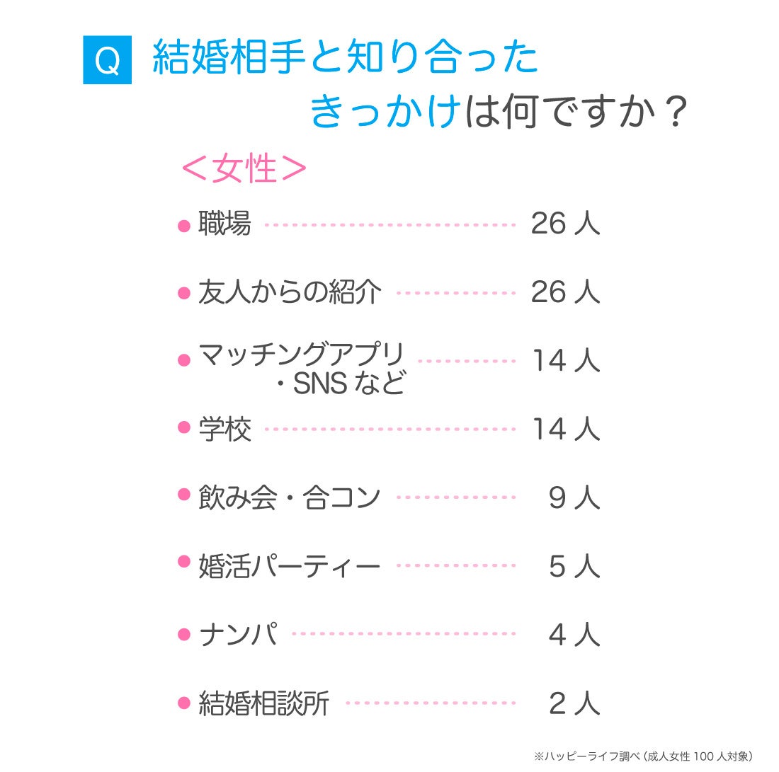 女性が結婚相手と出会ったきっかけは「職場」「友人からの紹介」が同率一位です。