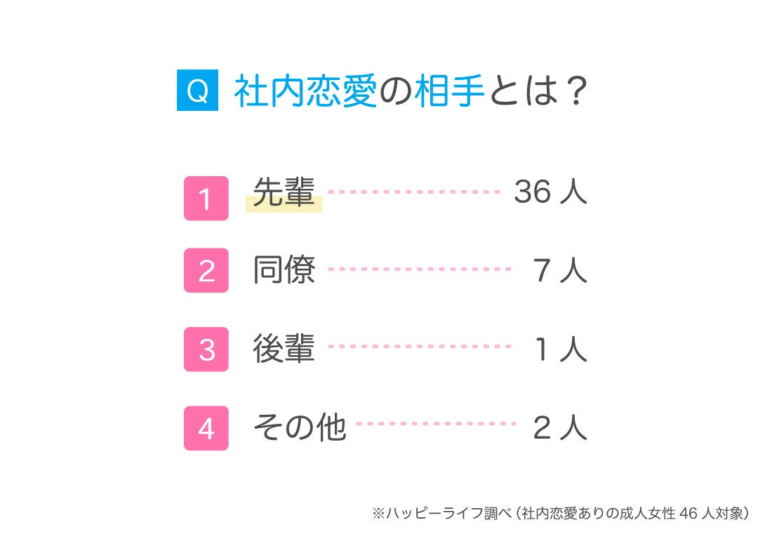 男性は「同僚」「後輩」と恋に落ちるケースが多く、女性の場合はダントツで「先輩」という結果に…!