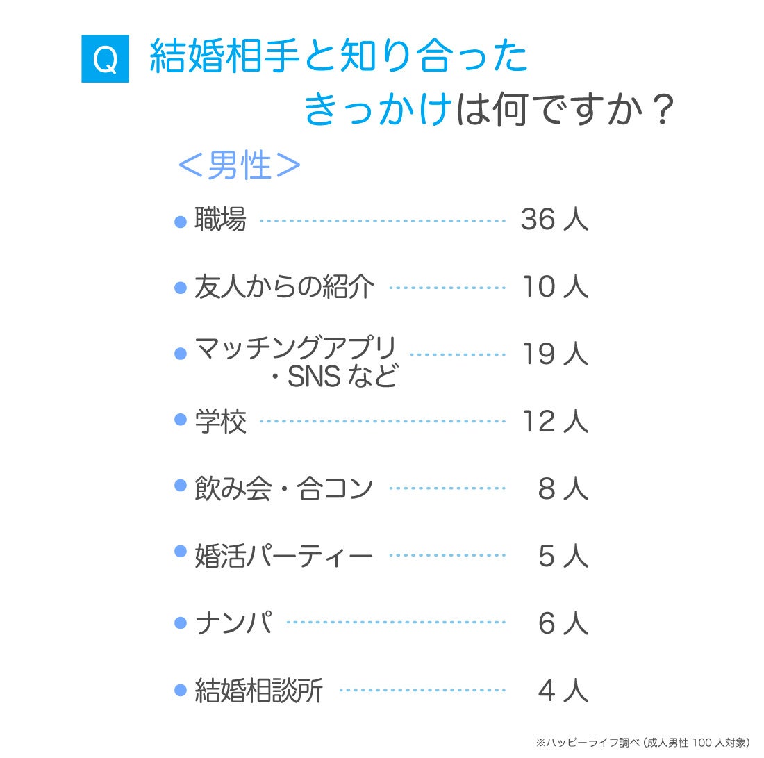 既婚男性100人にアンケート調査したところ、結婚相手と出会ったきっかけ第一位は「職場」でした。