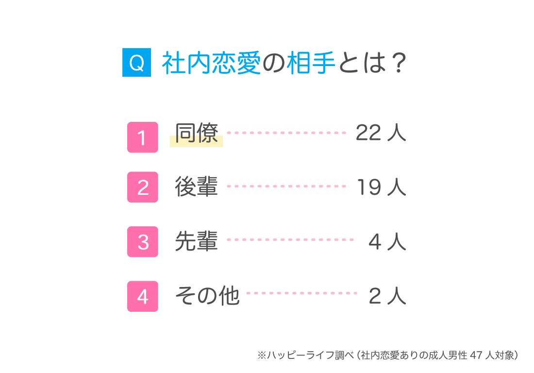 男性の場合、社内恋愛の相手は「同僚」が多く、次いで「後輩」だそうです。