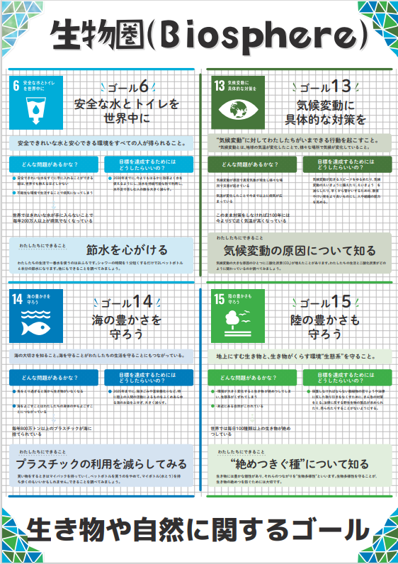 子どもたちでも理解しやすい表現やイラストで、SDGsの全体像や各目標同士の関係性などを解説します。
