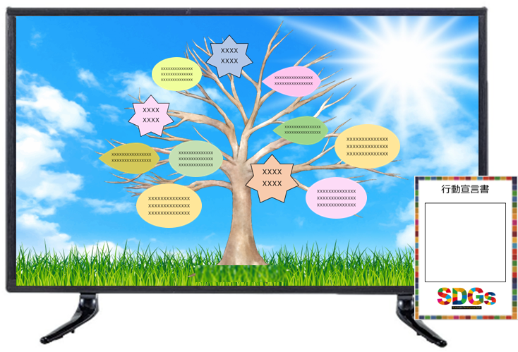 説明パネルやクイズ、動くぬりえなどでSDGsへの関心・理解を深めた後は、SDGsの取り組みに貢献するための行動宣言を行います。宣言したメッセージはスクリーン内の大きな樹木に表示されます。