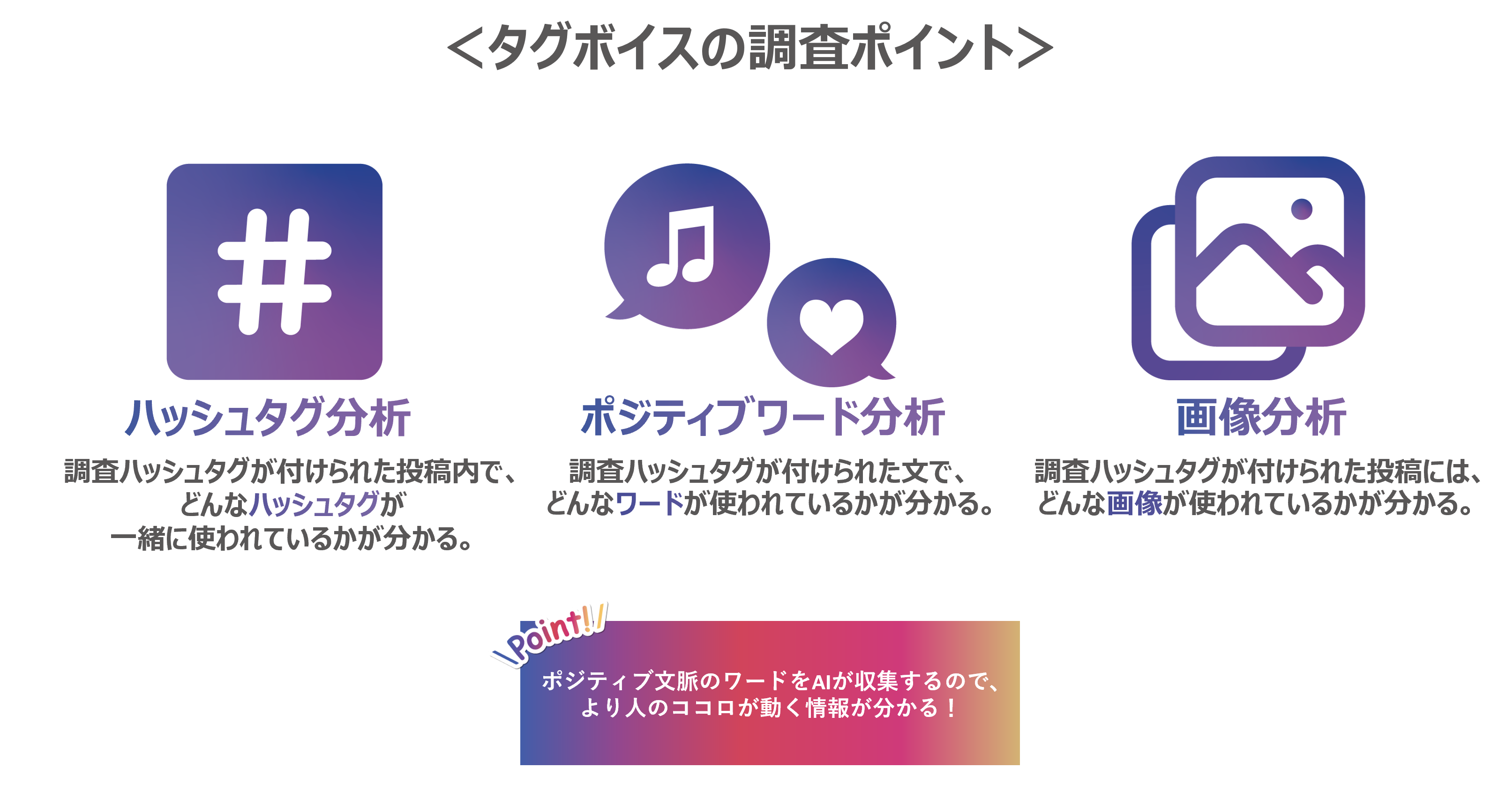タグボイスでは、アンケートなどの「定量的調査」では知ることが難しく、数値だけでは表しきれない「生活者の興味やトレンドの兆し」を発見することができるので、販促施策のヒントとしてご活用いただけます。