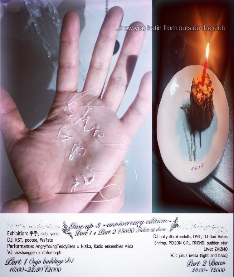 Part 1は展示と実演。アーティストの平手、slabにドールブランドyarilaが加わり、「Give up」シリーズ初出演のパフォーマンスアーティスト陣からAngryYoungTeddyBear x nizika、Radio ensembles Aiida、DJはKST、pootee、Wa?steが出演。当日のVJはaizshanggen x childmorphが担当。