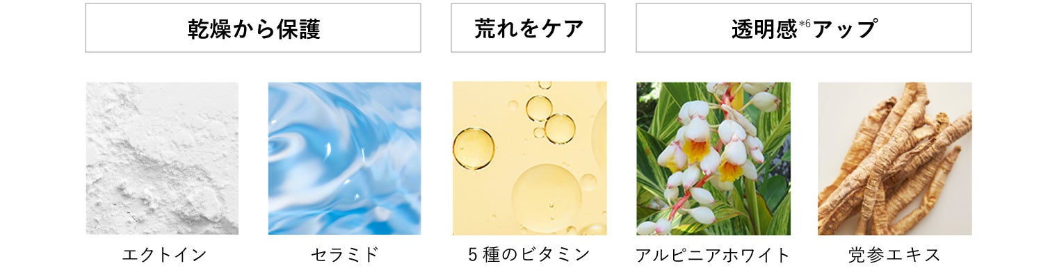 *1 ビタミンEリン酸Na、dl-α-トコフェロール 2-L-アスコルビン酸リン酸ジエステルカリウム塩、リン酸アスコルビルMg、ビタミンE、ビオチン(整肌) *2 整肌 *3 ラウロイルグルタミン酸ジ(フィトステリル・オクチルドデシル)、N-ラウロイル-L-グルタミン酸ジ(フィトステリル・ベヘニル・2-オクチルドデシル)、N-ステアロイルジヒドロスフィンゴシン、ステアロイルフィトスフィンゴシン、ヒドロキシステアリルフィトスフィンゴシン(保護) *4 アルピニアカツマダイ種子エキス(整肌) *5 党参抽出物加水分解液(整肌) *6 保湿による