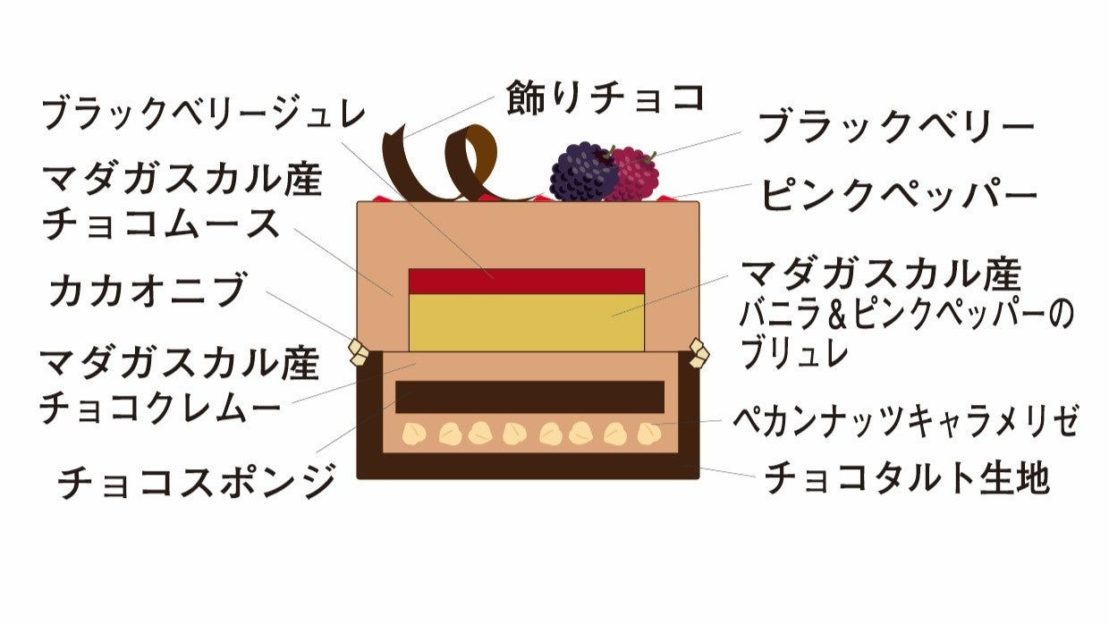 マダガスカル産カカオの濃厚ショコラを主役に、10年熟成バニラとピンクペッパーが香り立つ一品。ブラックベリーの酸味とペカンナッツの食感が重なり、まるでマダガスカルを旅するような奥深い味わいです。