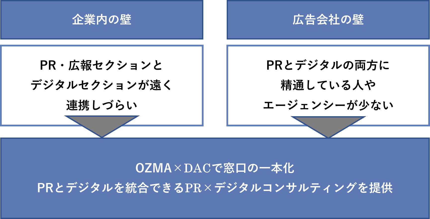 オズマピーアールはPR領域にて総合コミュニケーション戦略を立案・実施まで様々なソリューションを提供しており、DACは広告会社や媒体社、国内外のテクノロジーパートナーに対して総合的なデジタルマーケティングサービスを提供しております。