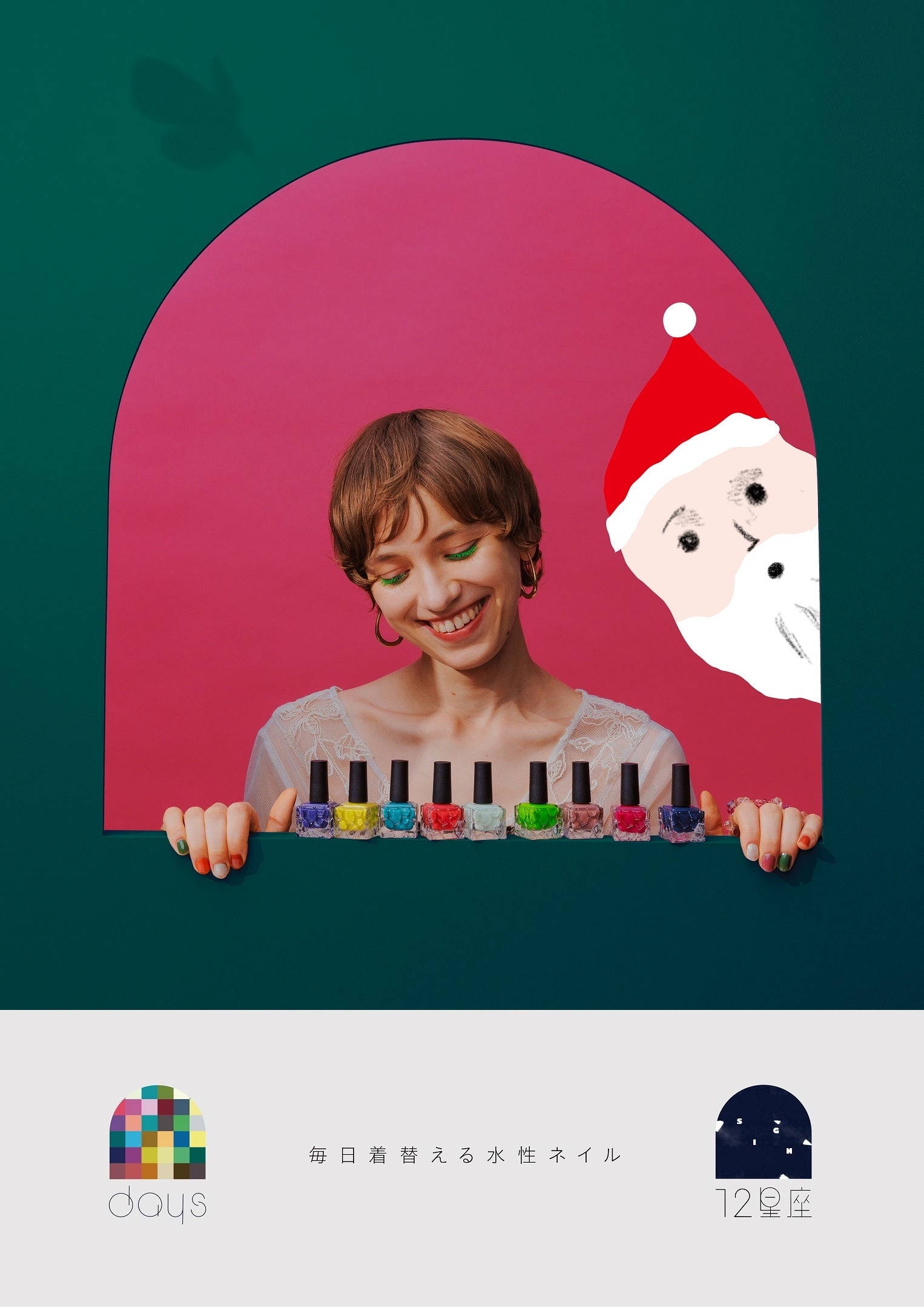 サステナブルな水性ネイルとして注目を集める「12星座&days」。全て水性ネイルで、環境にも肌にも優しく、お湯でオフできるのも魅力です。ぺンタイプで持ち運びしやすい「MYSISTER」と、星座をイメージしたラメネイルの 「12星座」、366日分 のカラーから選べる 「days」のPOP UPを開催します。今回は「12星座」から、クリスマスをイメージした限定カラー“Noel”が登場。光の角度によって色が変わる偏光ラメ入りのネイルポリッシュは、指先を華やかに彩ります。
