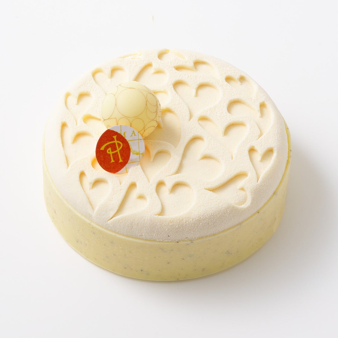 バニラ風味のガナッシュとビスキュイの豊かな味わいと、サブレの歯ごたえのコントラストが奥深い、バニラ尽くしのケーキです。表面はたくさんのハートをかたどって、華やかにデコレーションされています。(直径12cm×H4.5cm)