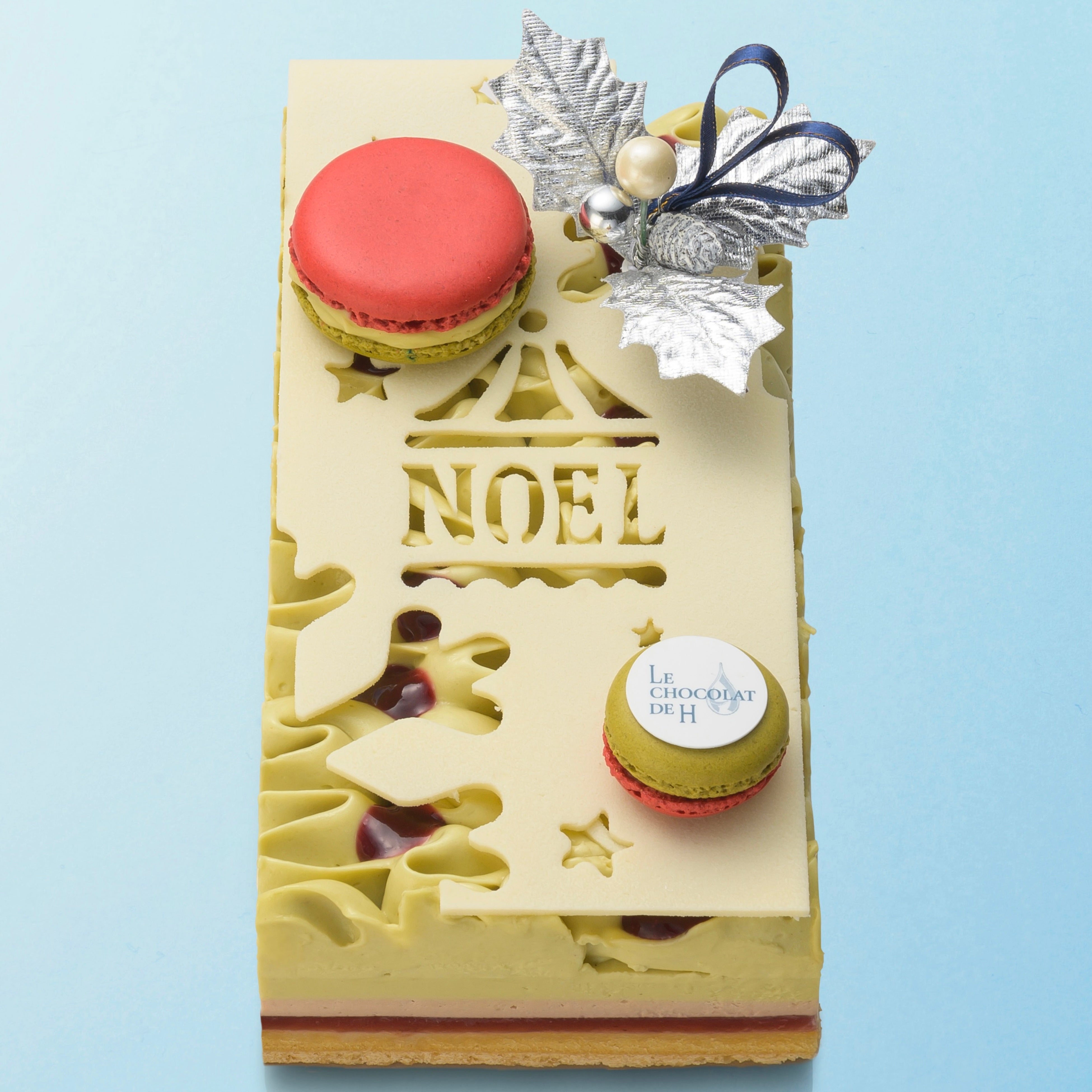 ピスタチオクリームとショコラオレのクリームに、さわやかな味わいのピンクグレープフルーツとバラのジュレを重ねたクリスマスのための特別なケーキ。サブレ生地やグレープフルーツ風味のパン・ド・ジェーヌなど、素材の持ち味を生かした深い味わいです。(W9cm×D18cm×H9cm)