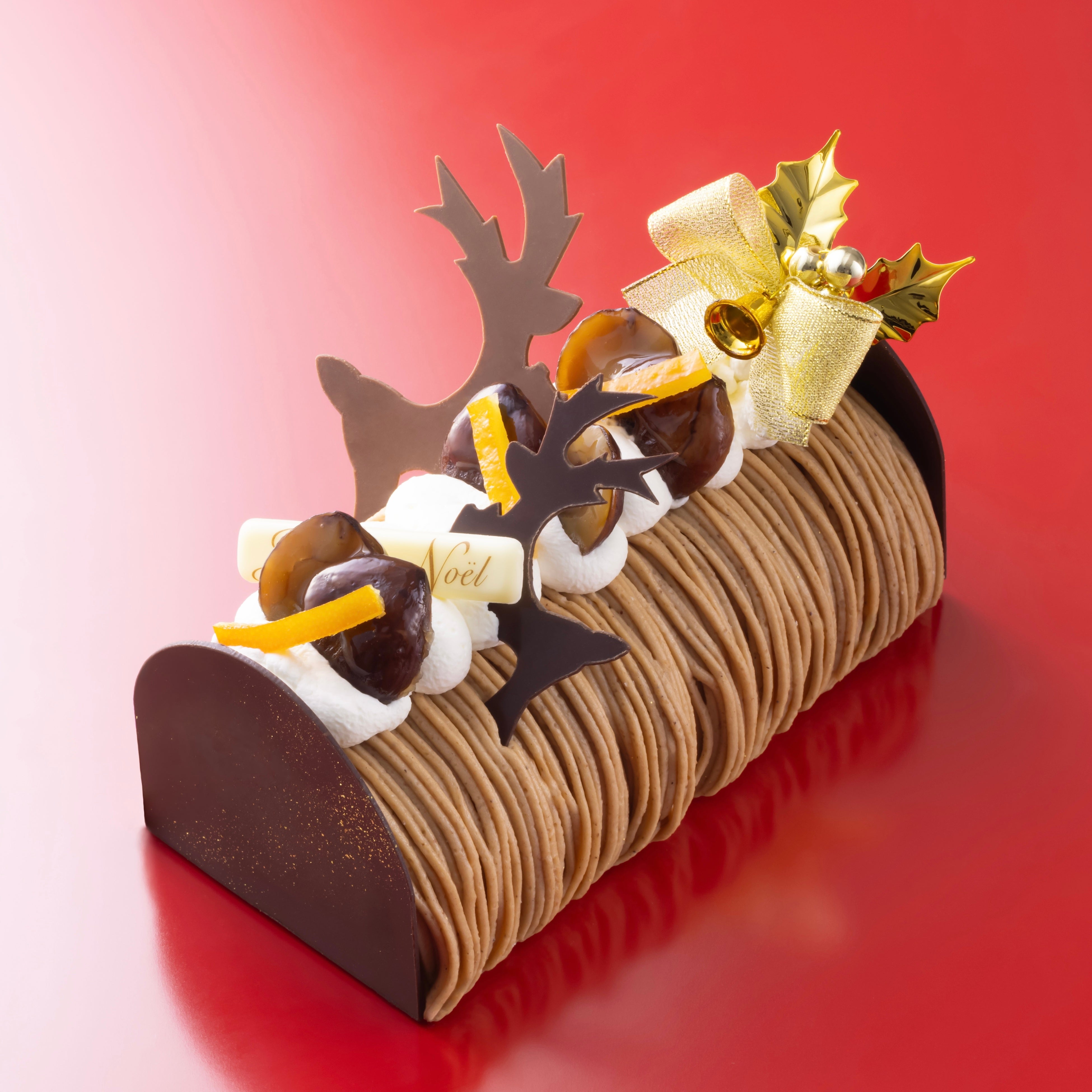 クリスマスケーキの定番ブッシュ・ドゥ・ノエルをモンブランで表現しました。マロンムースの中に、キャラメルブリュレとジュレオランジュが入っています。