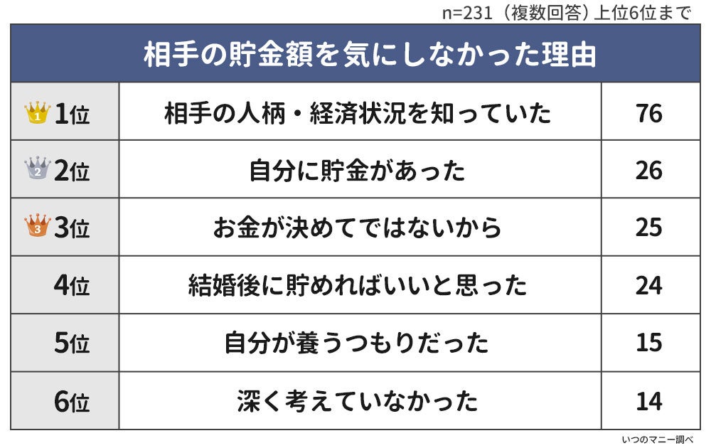 ・結婚相手の貯金額が気にならなかった理由1位は「相手の人柄・経済状況を知っていた」