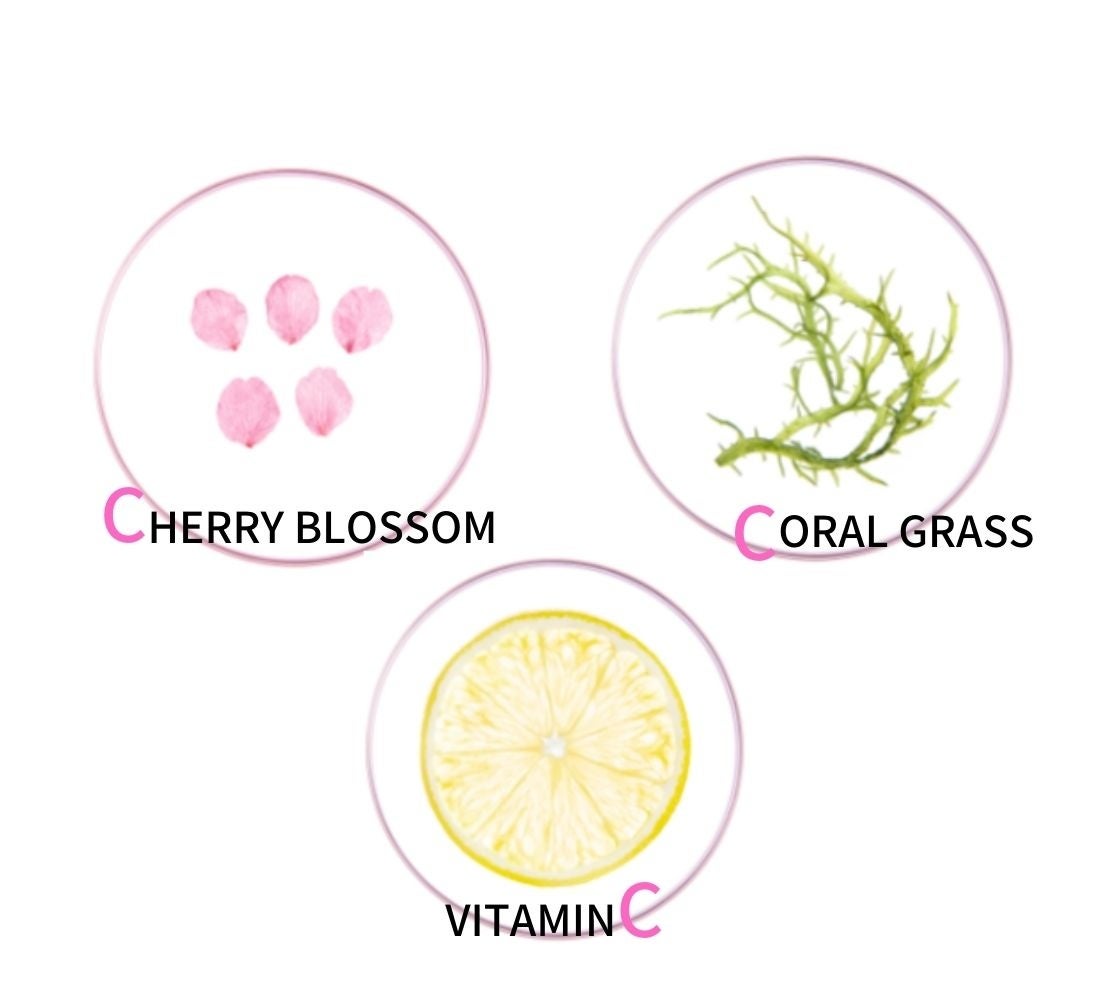 チェリーブロッサム、コーラルグラス、ビタミンCなどの特別な成分に加えて、チェリーピンクパールピグメントのユニークな配合が鍵となりました。 新生ライトフルC3で、なりたい肌にさらに一歩近づきます。」