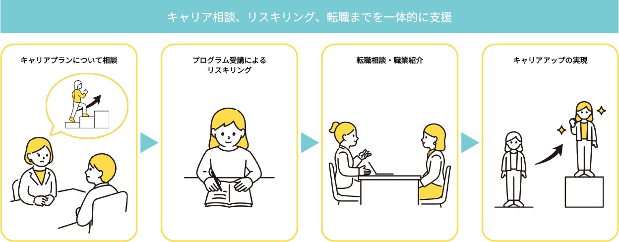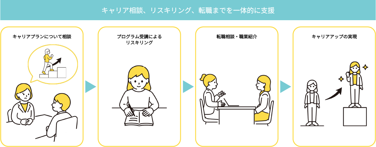 この事業は、リスキリングと労働移動の円滑化を一体的に進める観点から、在職者がキャリアアドバイザーに自らのキャリアについて相談できる「キャリア相談」、将来のキャリアプランを考えた上で必要なスキルを学ぶ「リスキリング講座の受講」、そして「転職支援」までを一体的にサポートする事業です。