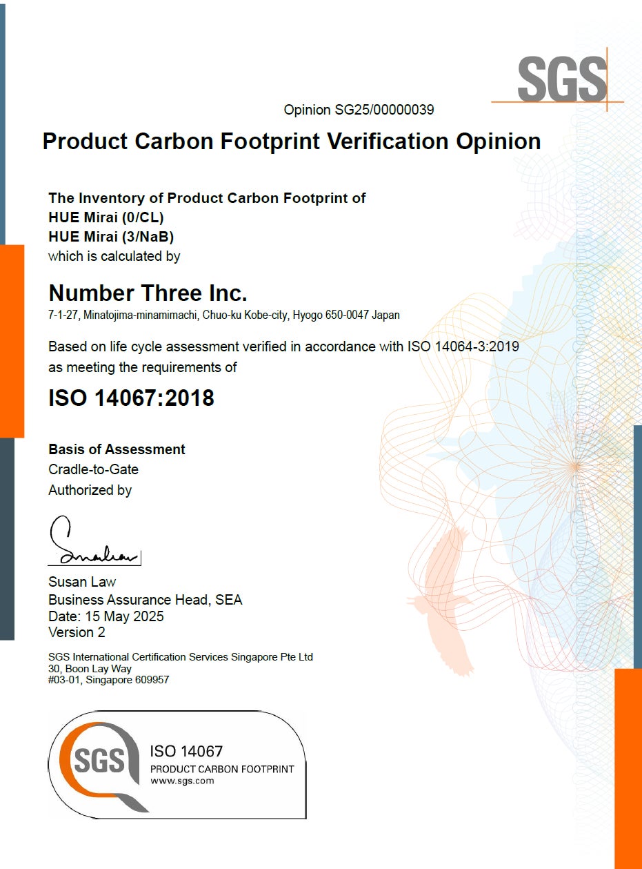 株式会社ナンバースリーは、HUE Mirai 0/CLとHUE Mirai 3/NaBにおいてISO 14067の第三者認証を2025年5月15日に取得したことをご報告いたします。