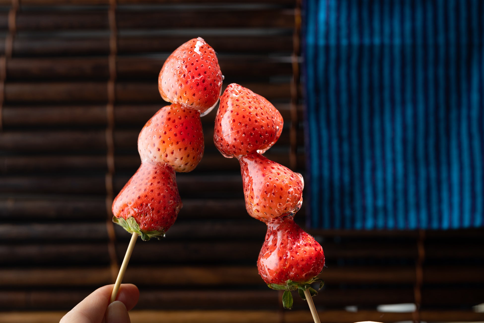 お祭りといえばいちご飴!みずみずしくてフルーティな夏いちごをキラキラの3連いちご飴にしました。浴衣でいらっしゃった方には、夏いちご飴を1本プレゼントいたします。