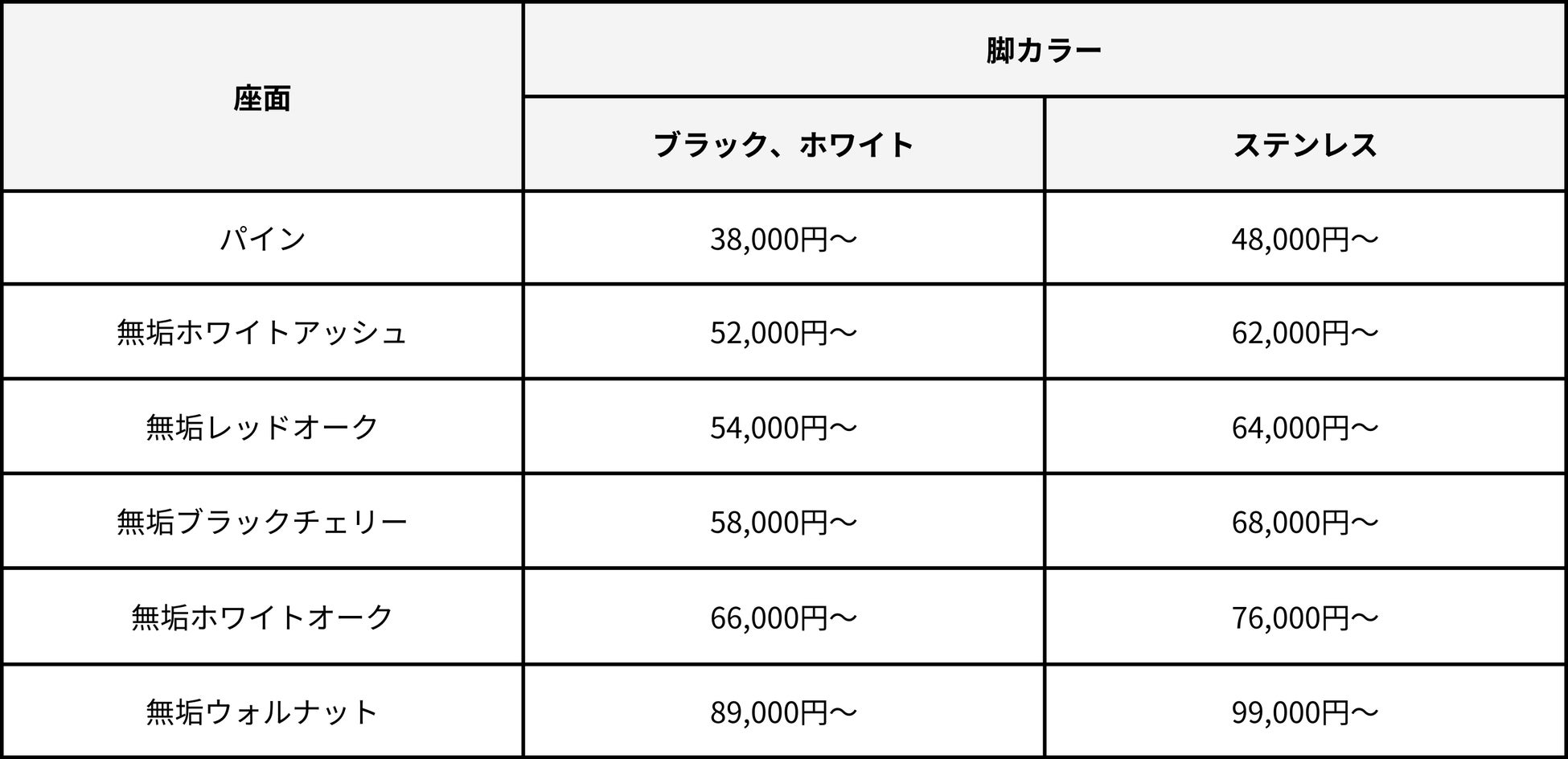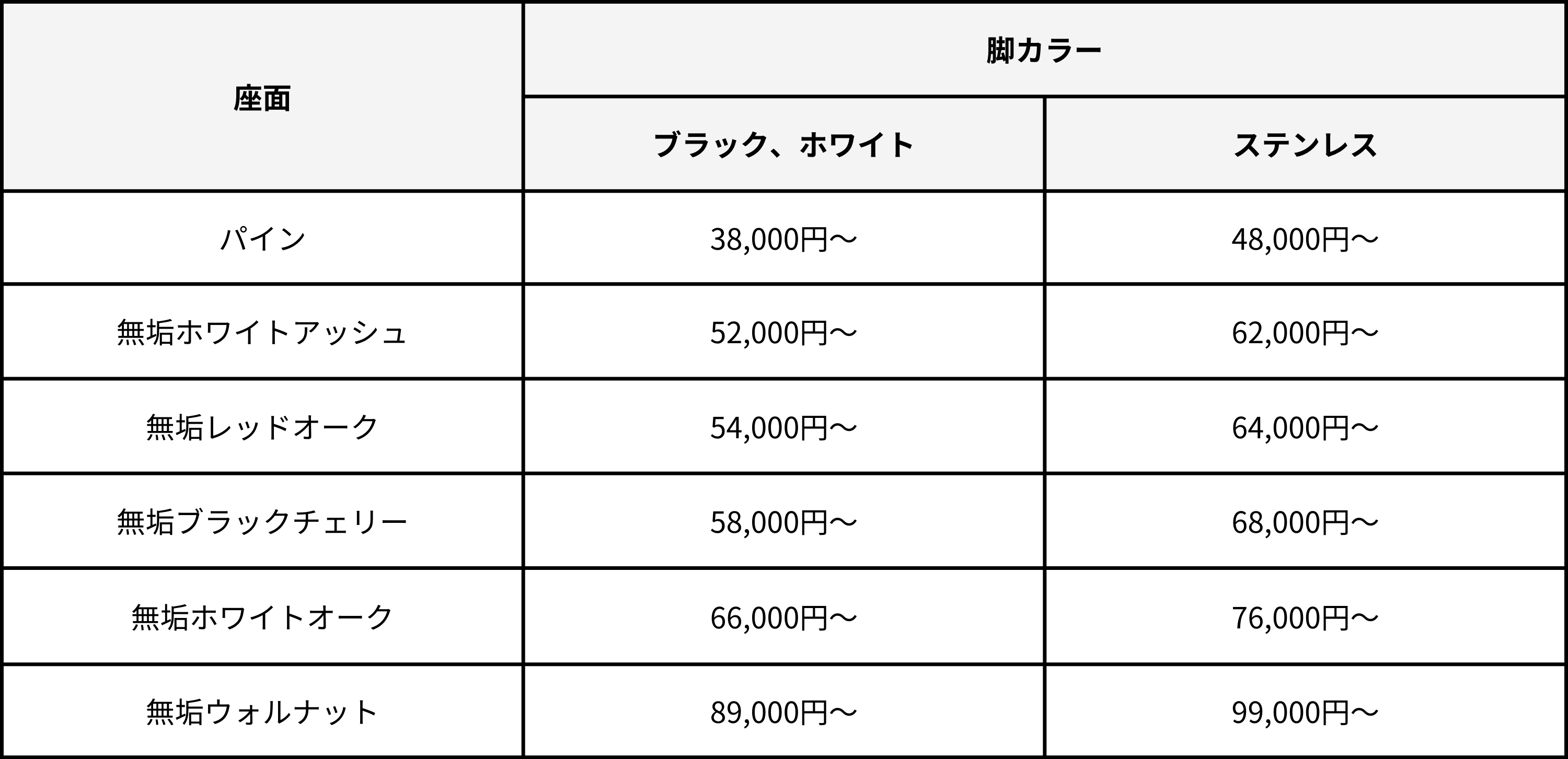 座面の短辺と脚の側面をぴったりと揃えた構造で、正面から見ても横から見てもすっきりとした見た目です。
