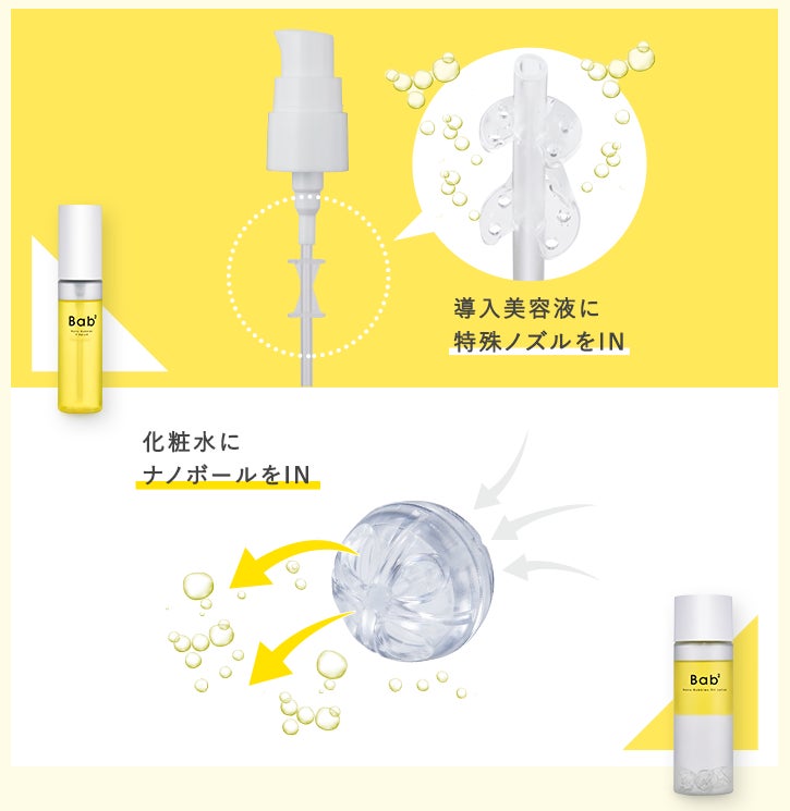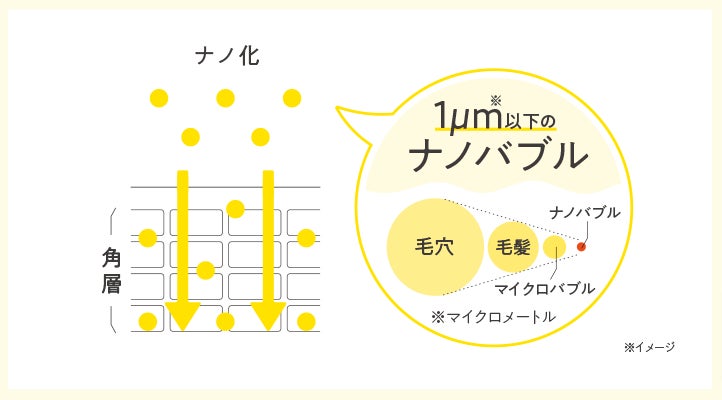 美容液には特殊ノズル、化粧水にはナノボールといった部材を採用。容器をシャカシャカとよく振ることで、毛穴よりもはるかに小さい1µm(マイクロメートル)以下の超微細なナノバブルが発生し、美容成分*³を届け*⁵、効果*⁴をサポートします。