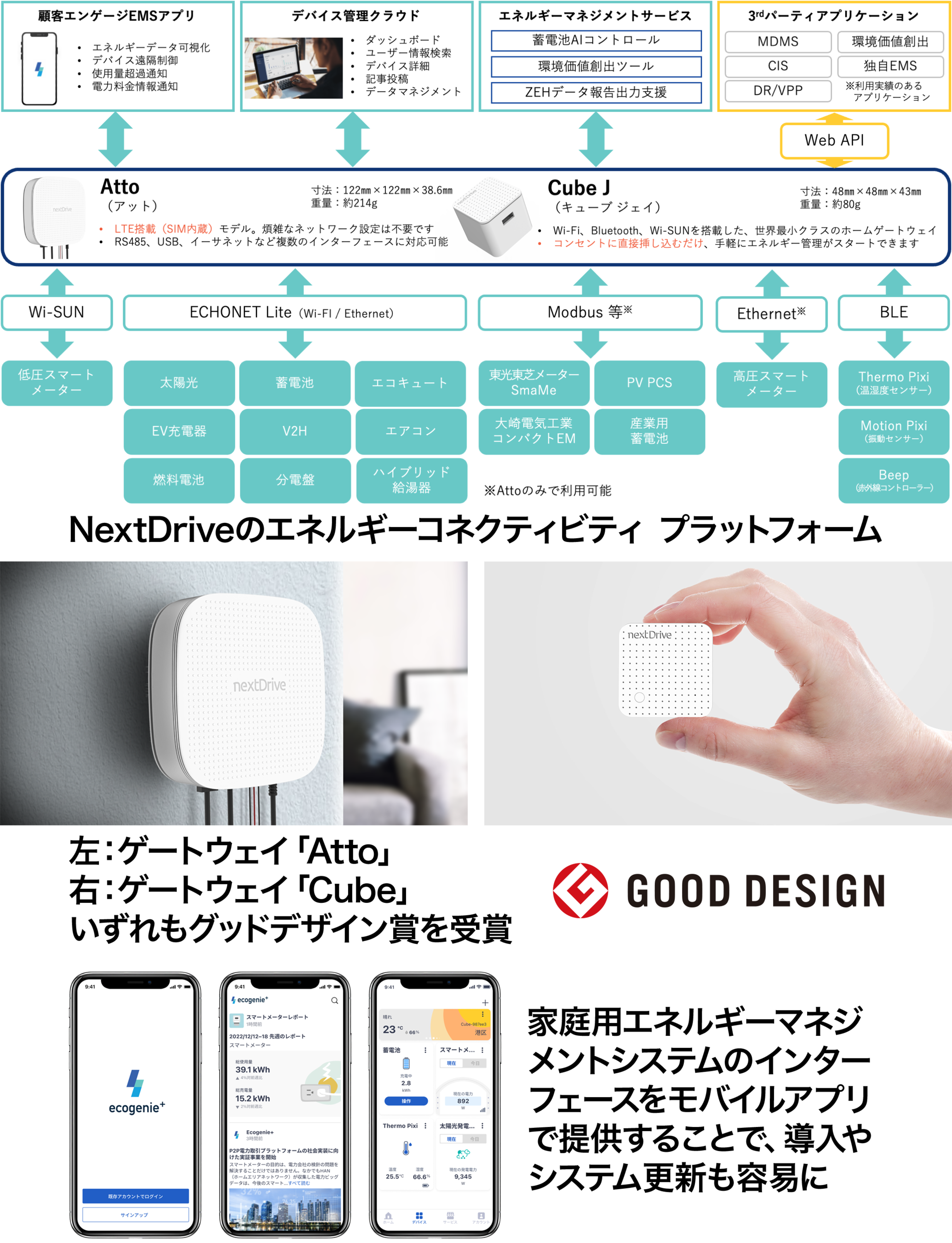 NextDriveは2023年2月1日(水)~2月3日(金)に東京ビッグサイトで開催される「ENEX2023 第47回地球環境とエネルギーの調和展」にて、受賞企業/団体のみが展示を許される「アワードコーナー(小間番号 4A-03)」に加えて、小間番号 4G-06、神奈川工科大学 スマートハウス研究センター/エコーネットコンソーシアム内にも出展しています。