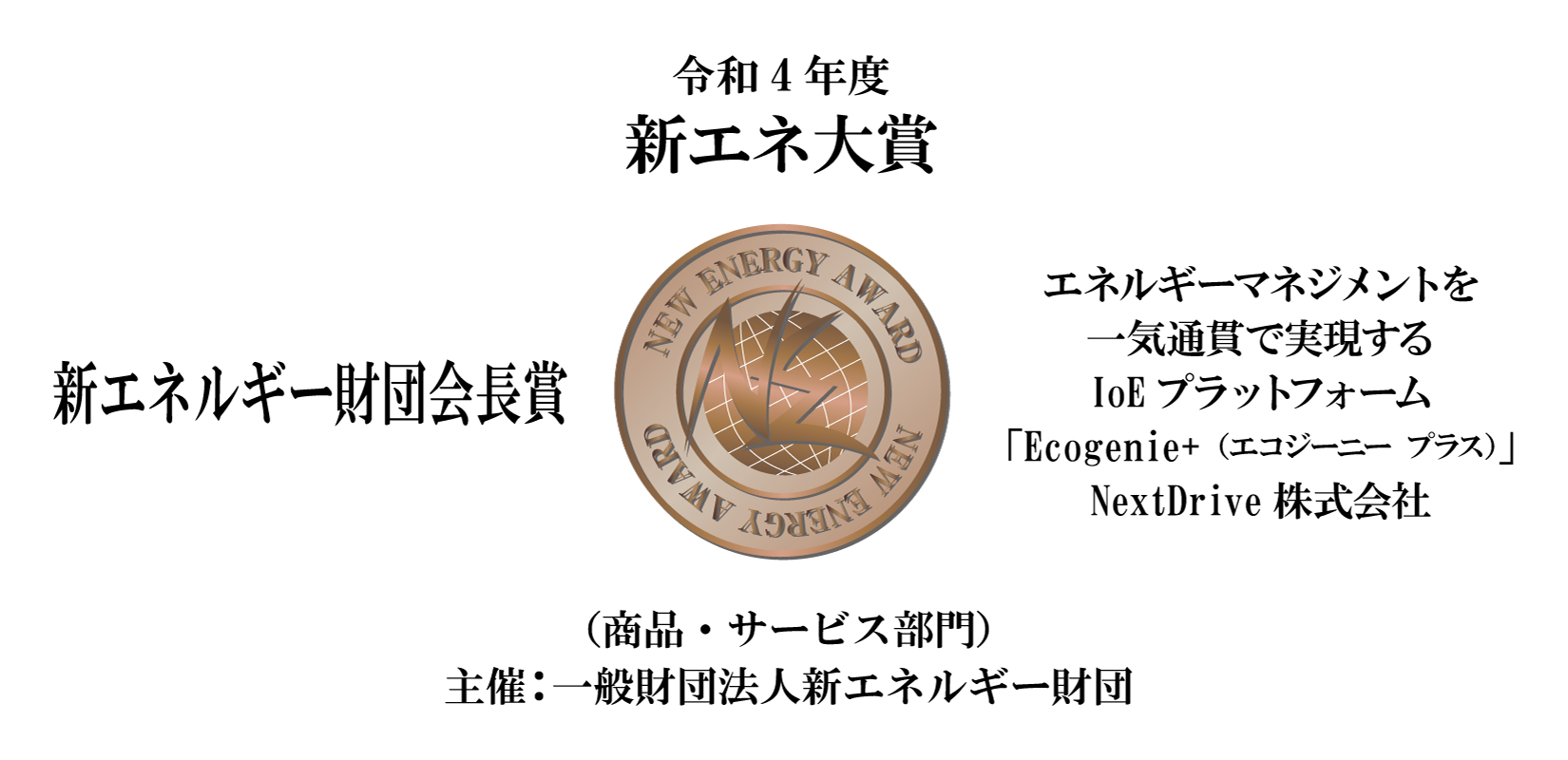 エネルギー管理とクラウドサービスの開発・提供に取り組むNextDrive株式会社(東京都港区西麻布3-19-22/代表取締役社長:石 聖弘/以下「NextDrive」)は、令和4年度 新エネ大賞 - New Energy Award -(主催:一般社団法人新エネルギー財団)において、IoEプラットフォーム「Ecogenie+(エコジーニー プラス)」が新エネルギー財団会長賞(商品・サービス部門)を受賞したことをお知らせします。