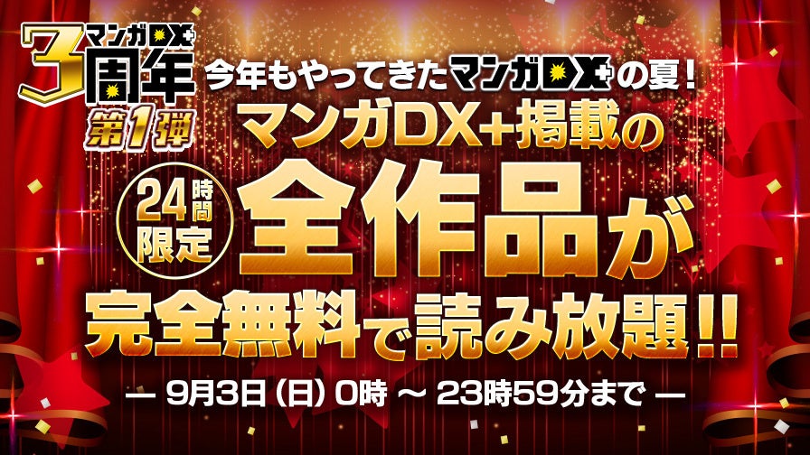 【マンガDX+ 祝3周年】<9/3・9/10~9/23>「24時間限定全作品無料読み放題」をはじめとするキャンペーンを開催!