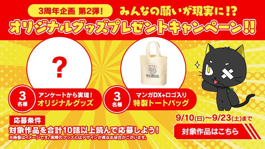 8月7日(月)~8月21日(月)に開催する「アナタの案が実際にグッズ化されるかも!? 第1回グッズ化アンケート」にて読者の皆様から最もご要望が多かったアイデアを形にし、グッズを抽選で3名様にプレゼントいたします。さらに、『マンガDX+』オリジナルトートバッグを抽選で3名様にプレゼントいたします。