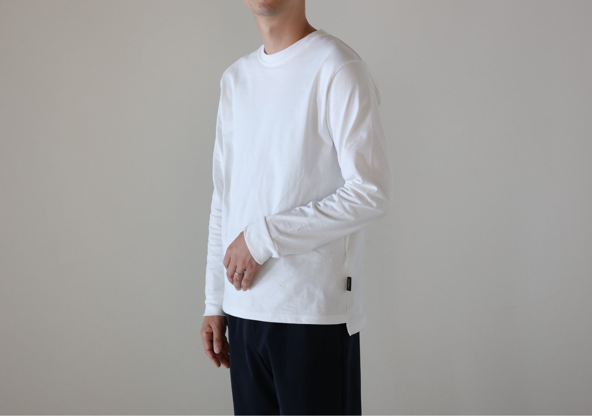 商品説明:CORDURAコットンが使用されたロングスリーブTシャツ。裾脇にはCORDURAのネームタグ、袖口にはHYKE(ハイク)のロゴがあしらわれた、ミニマルながらも素材やシルエットへのこだわりを感じるアイテムです。